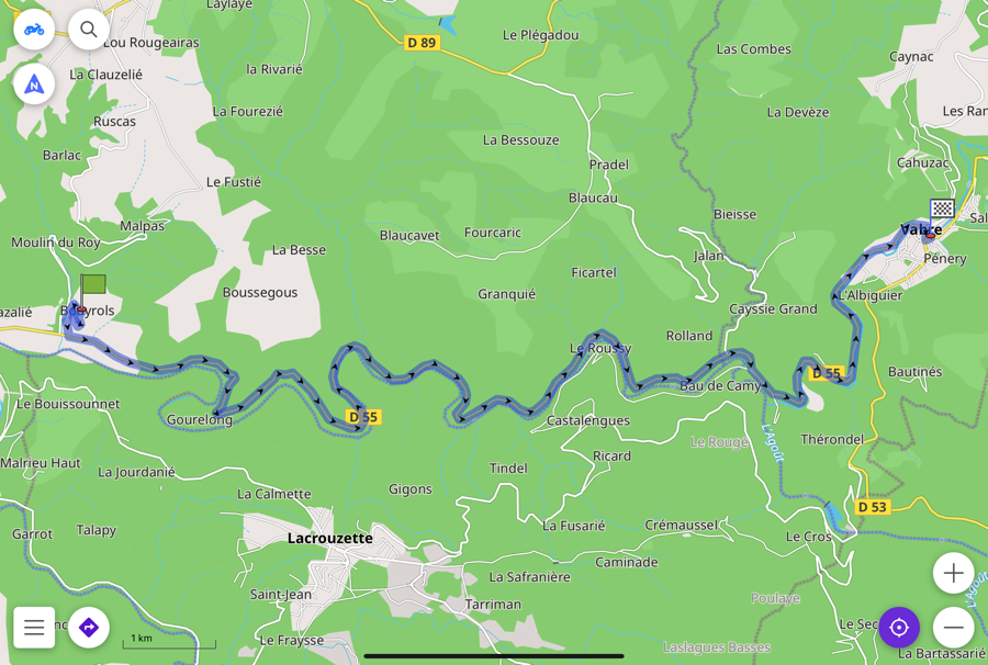 Le trajet proposé, que l'on identifie facilement ci-dessus, passe par la D55 et pars vers l'Ouest afin de rejoindre Roquecourbe et un chemin de terre, un GR balisé rouge/orange qui est aussi une ancienne voie ferrée. C'est, d'ailleurs, le même sentier que celui pris par le profil « petit_trail » mais pris plus tôt cette fois. Comme pour le profil « petit_trail », il rejoint la même route, à priori, bitumée qui passe au hameau du Roussy, puis rejoint la D55. Là, plutôt que partir et monter sur le chemin de terre amenant sur les hauteurs de Vabre, comme pour le profil « petit_trail », il continue sur la D55 jusqu'à Vabre.